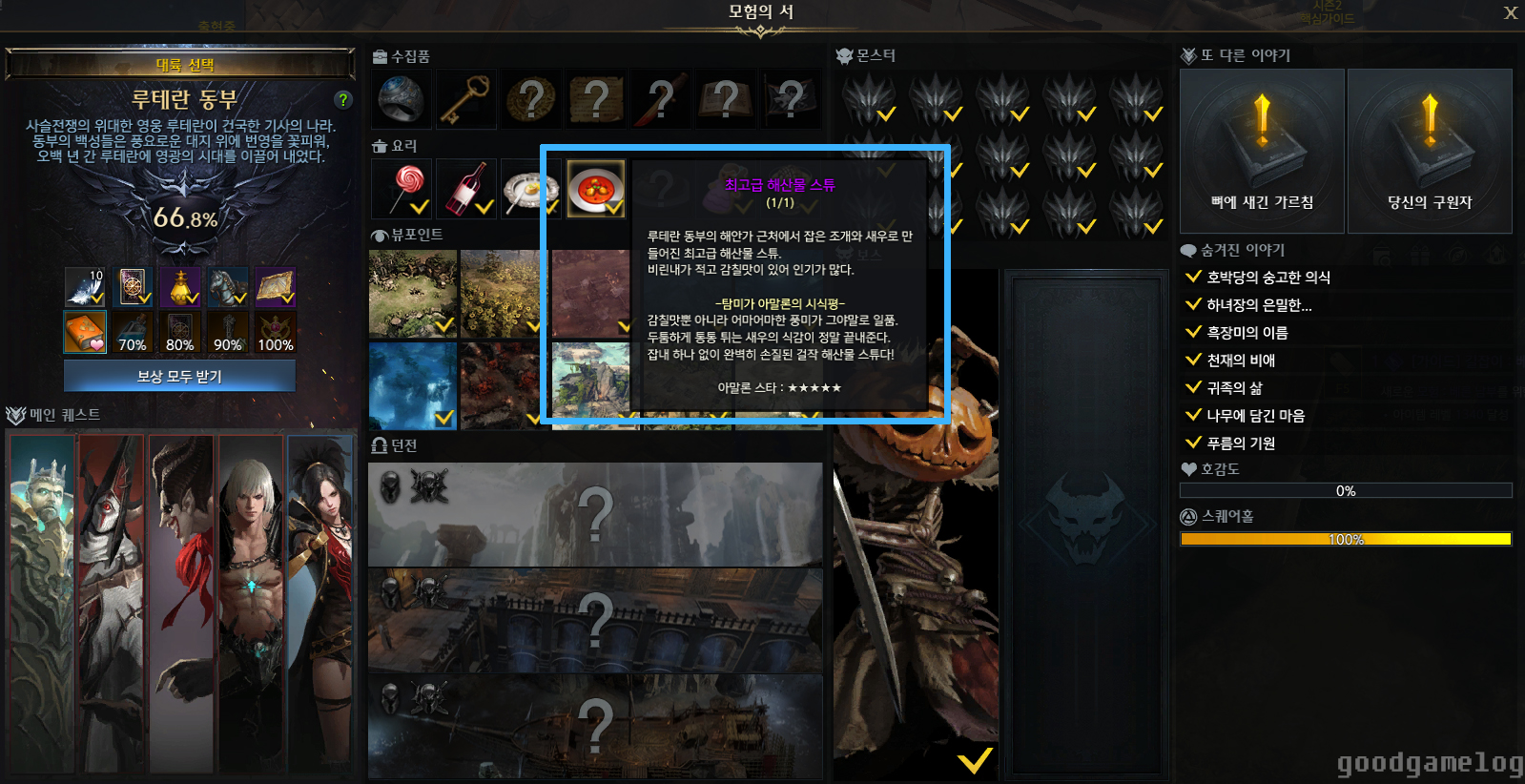 안녕하세요. 게임 블로그 goodgamelog입니다. 이번 포스팅은 로아에서 모험의 서 수집형 포인트인 루테란 동부의 요리 모음입니다. 모험의 서에서 루테란 동부의 모든 요리입니다. 순서대로 정